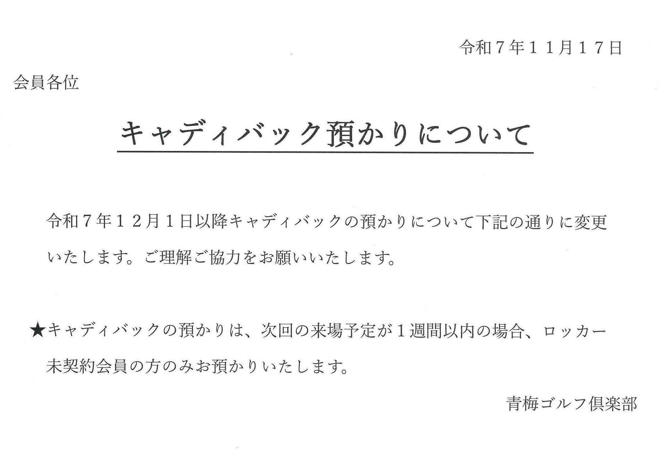 投稿日:2025.11.21/更新日:2025.11.21 お知らせ キャディバック預かりについて 現在、直近でプレー予定の方のキャディバックを倶楽部でお預かりしておりましたが、 キャディバックの保管場所の許容範囲を超えた為、キャディバックの預かりについて 下記の通りとさせていただきます。 ご理解・ご協力をよろしくお願いいたします。