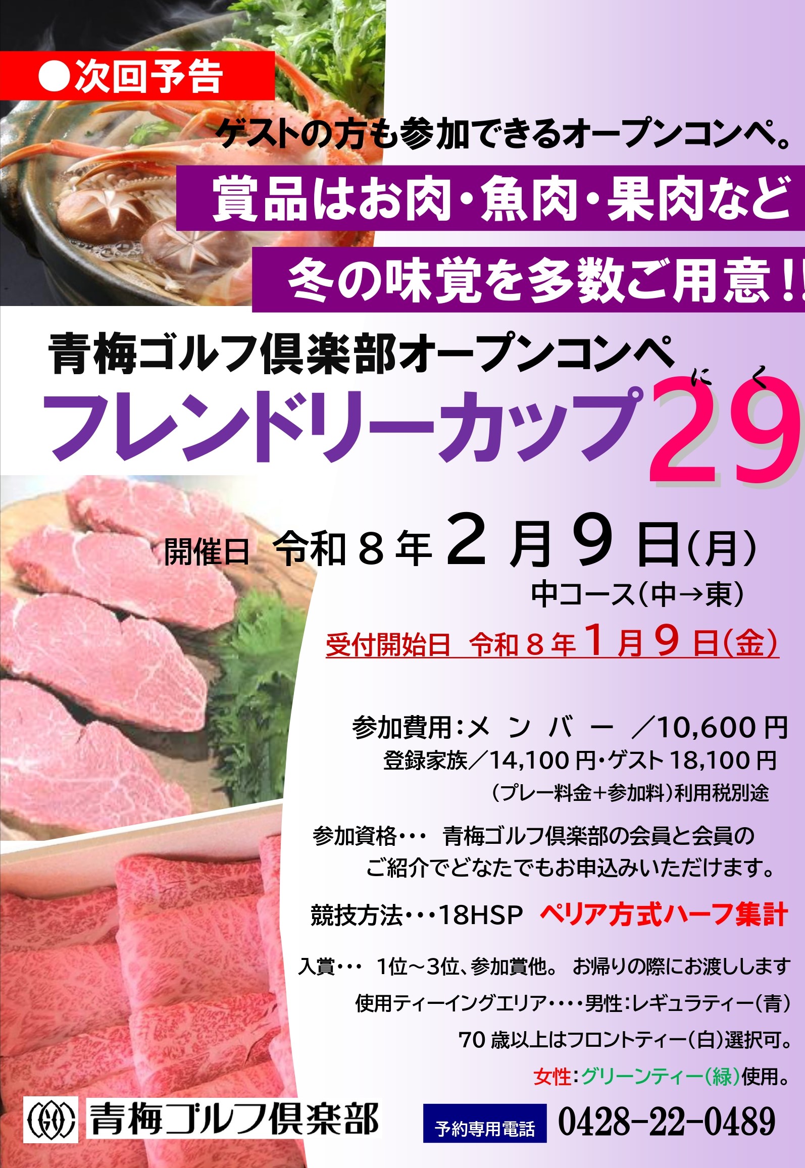 投稿日:2025.12.22/更新日:2025.12.22 お知らせ 臨時競技 フレンドリーカップ開催のお知らせ 令和8年2月9日(月)にフレンドリーカップ29を開催いたします。 ゲストの方も参加いただけるオープンコンペです。 詳しくは下記内容をご確認ください。みなさまのご参加お待ちしております。
